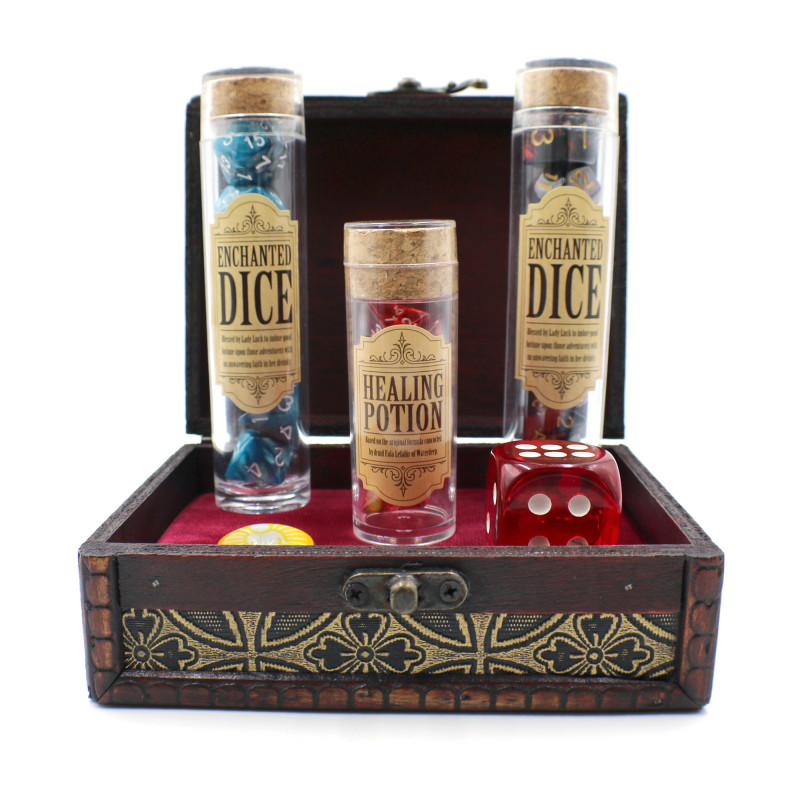 This D&D gift set features a wooden storage box, two D20 dice sets, a healing potion, giant D6 die and a glass inspiration token.
