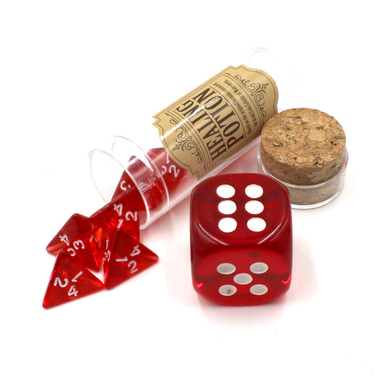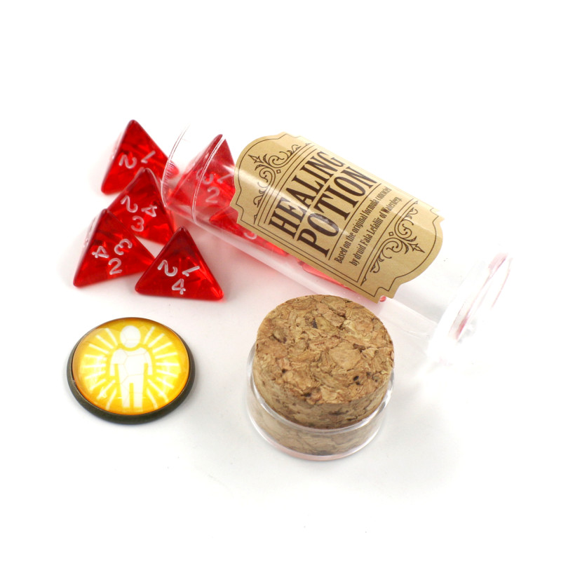 - Healing Potion - Red D4 dice and acrylic healing potion bottle.
