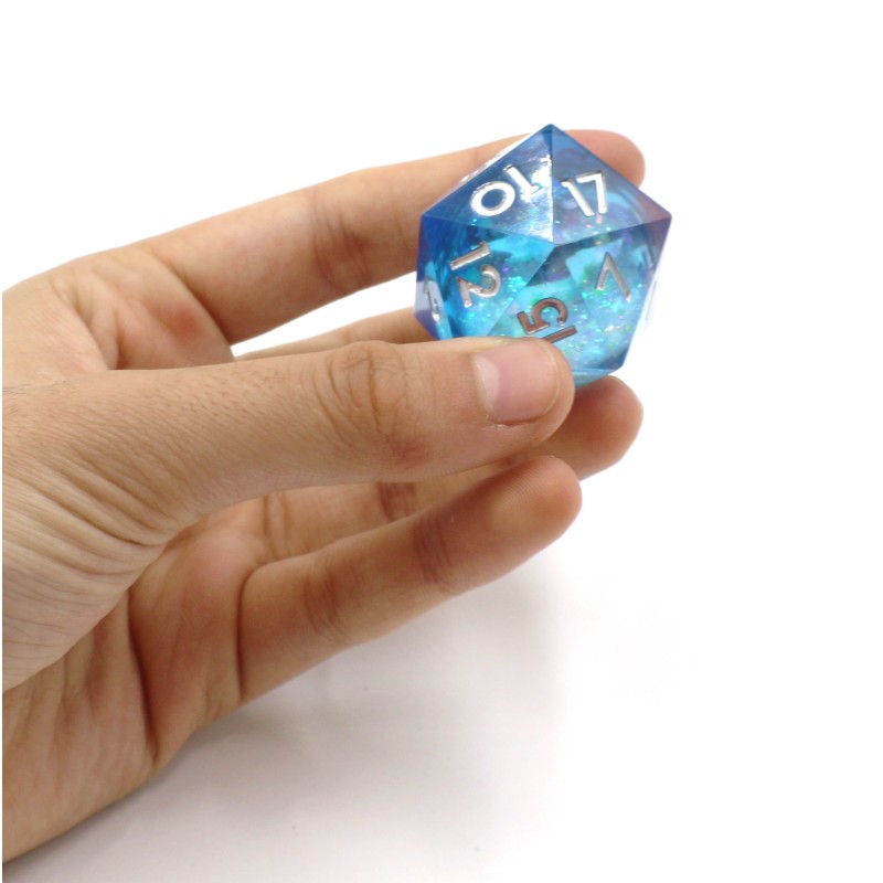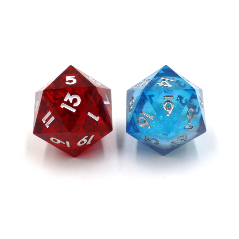 The dice are made from injection moulded acrylic and feature a liquid centre with glitter to give the dice a sparkling aesthetic.